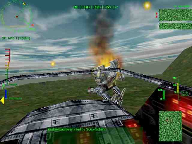MECHWARRIOR3 I have been a fan of MechWarrior games since MechWarrior 2 Mercenaries. I would play that game almost every day on Instant action. The idea of building a Mech and then fighting three or more other Mechs, going on Kali and playing there was a lot of fun. Now come Mech3, well those games might be collecting dust and for good reason. The thing that awed me the most was the 3D, how things look, how buildings explode, even how the Mech moves and shifts when taking damage. Mechs even hobble around when their legs are shot up. Things have changed some, I used to still fight when my Mech lost a leg, drop into external camera, twist the torso up and start blasting. That's gone, now your dead. Targeting computers that help you lead a target and hit a specific spot. New equipment and other items will keep you glued to the game. Pezboy and I started out with new custom Mechs. I had an Avatar and he had a Mad Cat with jets. Pezboy (aka Jump-Jet Boy) and I would just walk around at first, we saw a train come out of a tunnel and come down a raised platform. We started blasting the thing, it flew off the tracks and onto the ground in colorful explosions. We also went into a massive cavern, we didn't shoot each other and just walked around. There's also bridges, mountain pass tunnels, factories. The detail in this game is awesome. Sooner or later we started blasting each other, unlike Mech 2 you can get knocked down from a massive bombardment, you can crouch, have missing limbs smoke, see bullet holes on your cockpit. Lastly multi-player was smooth and no noticeable lag over IPX or TCP/IP with a serial cable direct connection. Some things I miss from Mech2. The keyboard is missing some important commands. I used to like shifting from weapon to group to group and having the option of firing them all or just one at a time. Also there was fire group 1, 2, and 3 right above the movement keys. Some things I don't miss, well damage is a lot more realistic and quick in Mech 3. Come head on into a blaze of auto cannons and PPCs and you'll walk away hurting. I mean in Mech2, PPC blast after blast and laser after laser and most Mechs were only yellow and moving full speed. Also, you don't automatically eject from an internal ammo explosion. When you explode from overheating you have a strong blast radius. In short, a great sequel.