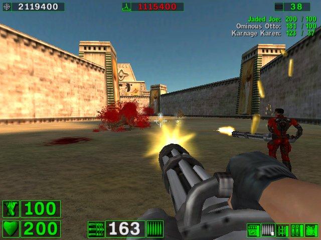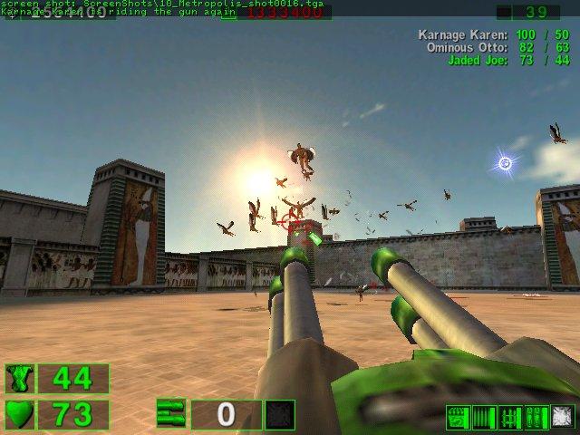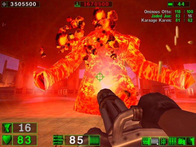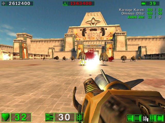 About Serious Sam That wasn't the case with Serious Sam, we were all glued to the game and it was well after eight o'clock when we stopped playing. Keep in mind we start playing games at 11 AM or so. By the time we got to Serious Sam we already had a few hours in with other games. At six, seven, and even at eight o'clock Pez kept saying in a few minutes I have to go, then half-an-hour later we're still playing. Even Miss Bad, who I thought retired, liked the game, but she had to suffer with the poorest performance using a AMDK62-500 with a now dated and out of business Voodoo 3 card. I felt really bad and there was nothing I could do, the settings were already at the lowest detail and resolution possible. I can probably surmise the game in one paragraph. You fight hordes of increasing harder monsters with some serious firepower (alright I slipped on one). There's no objectives other than going to the next area and killing monsters. I know, I thought it was a dull idea too, but the co-op play brought us back to the days of Quake 2 Co-op and being able to play the game for the first time together--everything was fresh and a lot of fun. Miss Bad made a good point, that after the first time through it might stop being as much fun. I'll have to double check that one. I tried playing single player and it felt kind of boring, so she might be right. I still recommend it, it's cheap, has a great graphics engine, and is a lot of fun. It also has a model importer and map editor built in. Just make sure your system can handle it. I didn't have any bad slow downs with a Pentium III-450 and a TNT 2 Ultra card. I also had the settings turned down to the minimum. AMDK62 and Celeron based computers may have some trouble, see I didn't say serious trouble. (6/16/01) | ||||||||